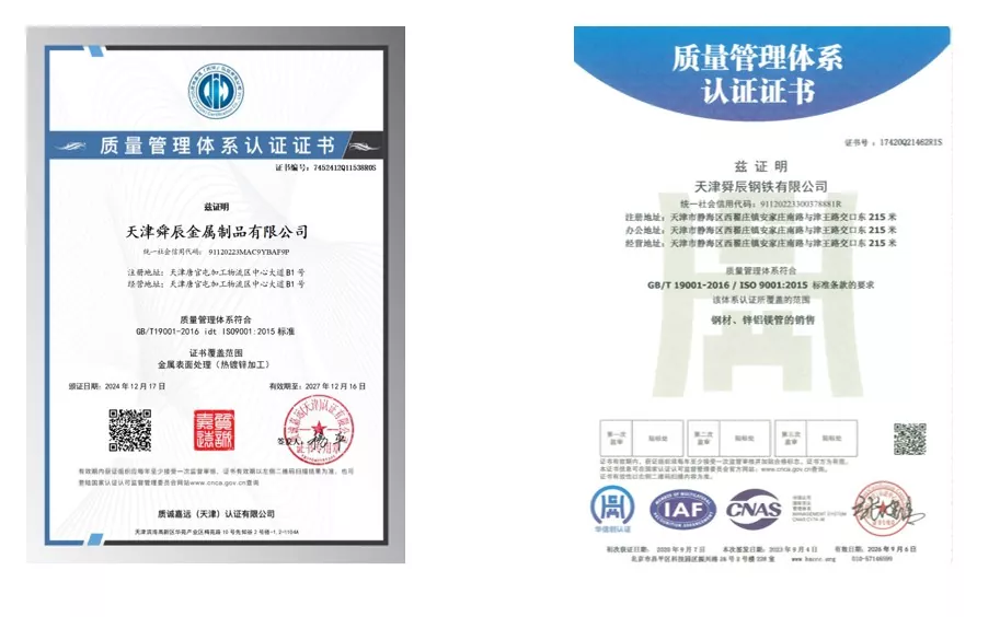 အဘယ်ကြောင့် ကျွန်ုပ်တို့ကို ရွေးချယ်ရသနည်း?Tianjin Suncheng စက်မှုလုပ်ငန်းသည် နှစ်ပေါင်းများစွာ စုဆောင်းထားသော ထုတ်လုပ်မှုနည်းပညာကို ဂုဏ်ယူဝင့်ကြွားစွာဖြင့် 12 နှစ်ကြာ စံချိန်စံညွှန်း သုည ပုံသေနှင့် နှစ်စဉ် အရည်အသွေး အဖြစ်အပျက်များကို ထိန်းသိမ်းထားပြီး ထုတ်ကုန်အရည်အသွေးအတွက် ခိုင်မာသော အခြေခံအုတ်မြစ်ကို ချထားသည်။ ကုမ္ပဏီသည် အမျိုးသားထုတ်လုပ်မှုစံနှုန်းများကို တင်းတင်းကျပ်ကျပ်လိုက်နာပြီး ISO 9000၊ 3A စနစ်ထောက်ခံချက်များနှင့် EU CE လက်မှတ်များကို ကိုင်ဆောင်ထားသည်။ 12 အဆင့် လုပ်ငန်းစဉ်နှင့် 3-အလွှာ အပြည့်အဝ စစ်ဆေးရေးယန္တရားဖြင့်၊ ၎င်းသည် နှစ်စဉ် အရည်အသွေး သုညနှင့် ဘေးကင်းရေး ဖြစ်ရပ်များကို ရရှိပြီး ၎င်း၏ သက်သေ ခိုင်လုံမှုကို ပြသပြီး 12 နှစ်ကြာ မှာယူမှု သုည ဖြစ်သည်။ အချောထည်တစ်ခုစီသည် ထုပ်ပိုးခြင်းနှင့် ပို့ဆောင်ခြင်းမပြုမီ အခြောက်ခံခြင်း၊ စစ်ဆေးခြင်းနှင့် ကောင်းမွန်သောအချောသတ်ခြင်းများ ပြုလုပ်ပြီး အရည်အသွေးကောင်းမွန်ကြောင်း သေချာစေပါသည်။ ကုမ္ပဏီသည် ထုတ်လုပ်မှုလုပ်သား 300 ကျော်ကို ခန့်အပ်ထားပြီး ERW သံမဏိပိုက်များ၏ သတ်မှတ်ချက် ၂၃၆ ခုကို ထုတ်လုပ်နိုင်ပြီး ကွဲပြားသောလိုအပ်ချက်များကို တိကျစွာဖြည့်ဆည်းပေးနိုင်ရန် သတ်မှတ်ချက်များနှင့် စိတ်ကြိုက်ပြင်ဆင်မှုများကို ပံ့ပိုးပေးပါသည်။
